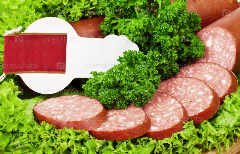 Колбаса с зеленым салатом и лист бумаги