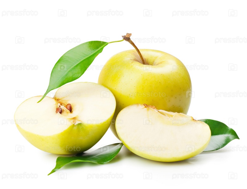 Желтые яблоки с листьями на белом фоне