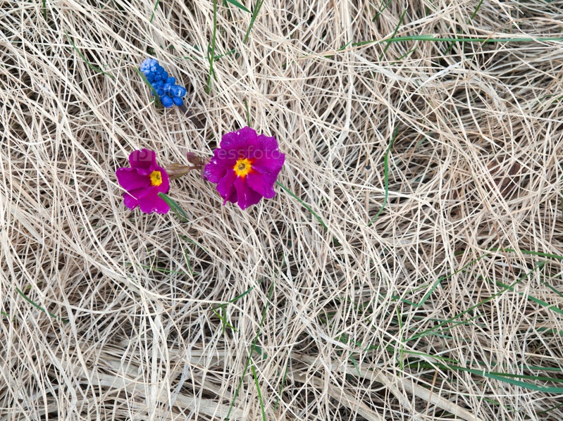 Ранние весенние цветы прорастают сквозь прошлогоднюю траву