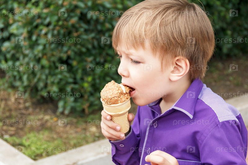 Белокурый мальчик ест мороженое