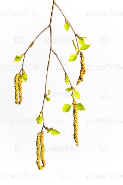 Ветка березы с серьгами и молодыми листьями