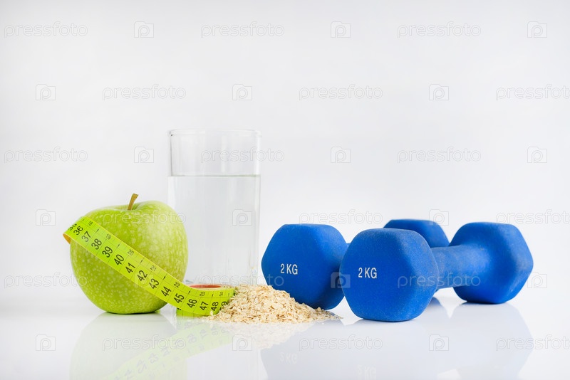 Гантель, зеленое яблоко и рулетка