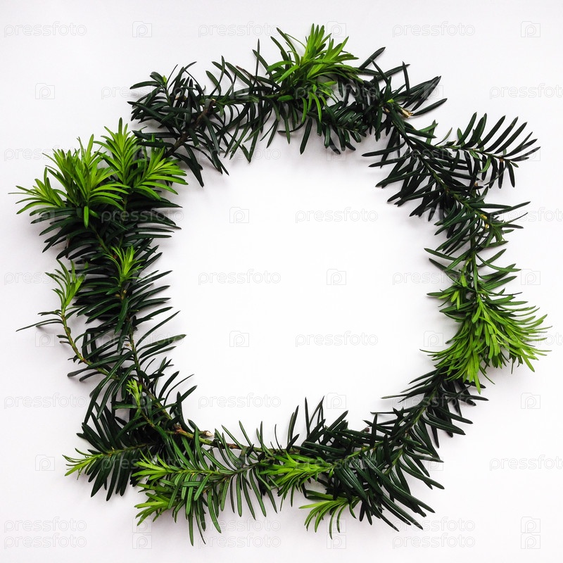 Венок из зеленых еловых веток на белом фоне