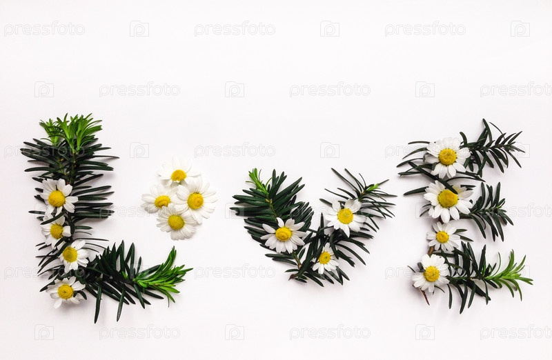 Слово Любовь, сделанное из цветков ромашки и еловых веток