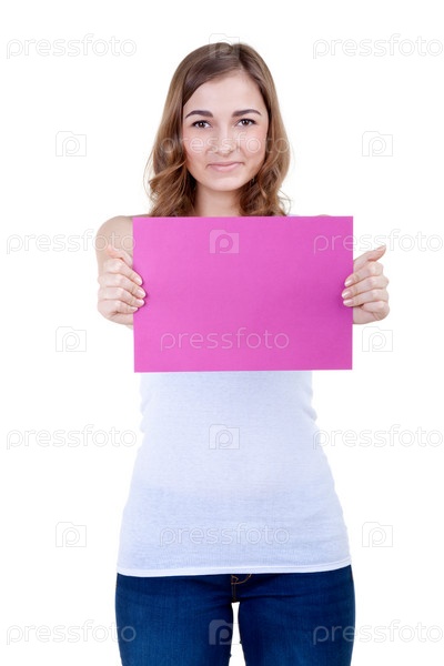 Красивая девушка с розовым листом бумаги на белом фоне