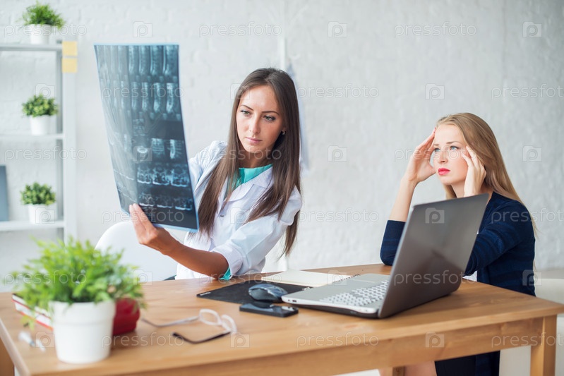 Женщина-врач, глядя на рентгеновские снимки пациента