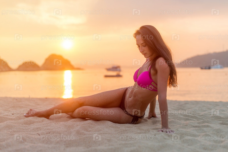 Загорелая девушка в бикини на пляже