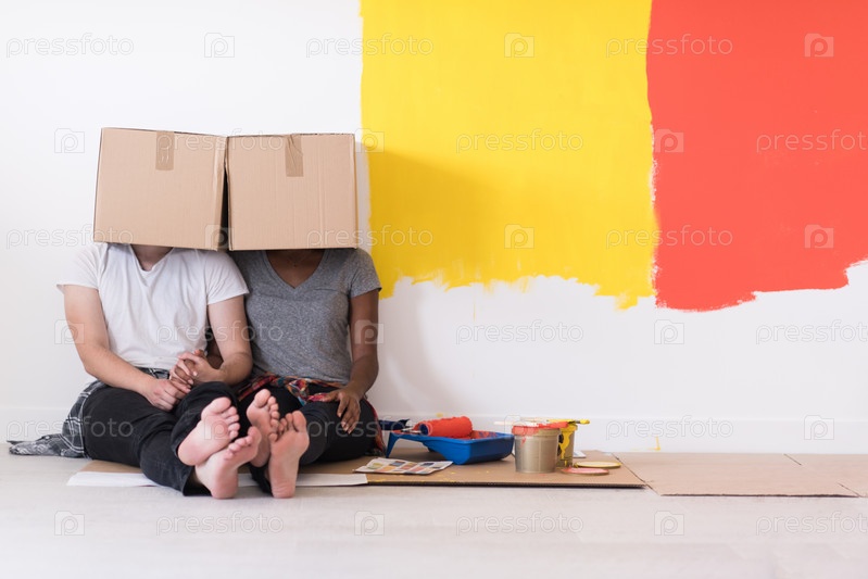 Молодая пара, играя с картонными коробками
