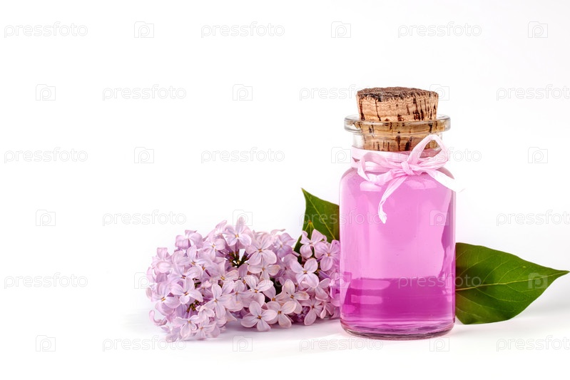 Стеклянная бутылка сиреневого масла и цветущих ветвей сирени