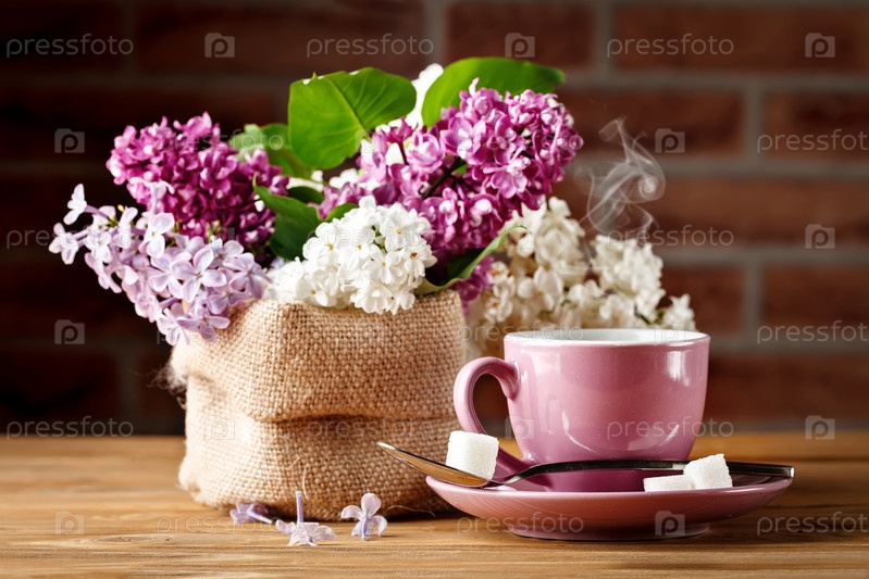 Натюрморт с ветвями сирени и чашкой кофе на деревянном столе