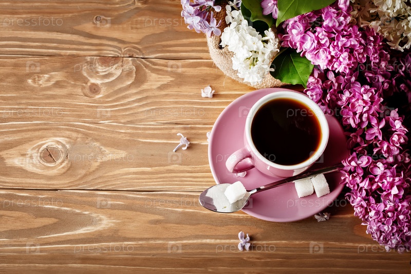 Натюрморт с ветвями сирени и чашкой кофе на деревянном столе