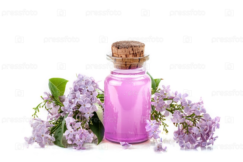 Стеклянная бутылка сиреневого масла и цветущих ветвей сирени