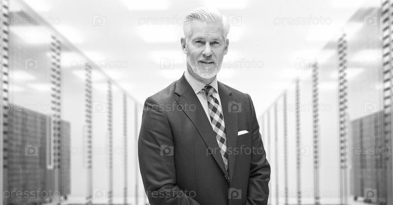Пожилой бизнесмен в серверной комнате