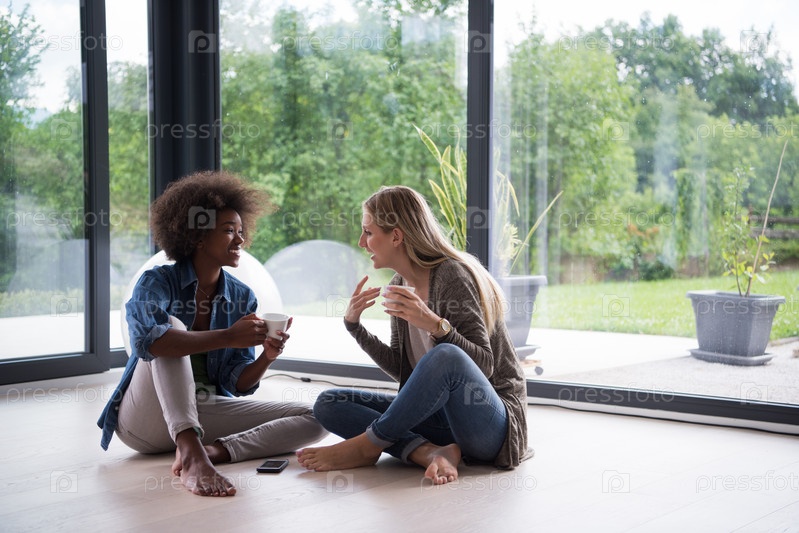 Многонациональные женщины сидят на полу и пьют кофе