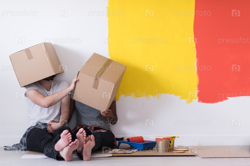 Молодая пара, играя с картонными коробками