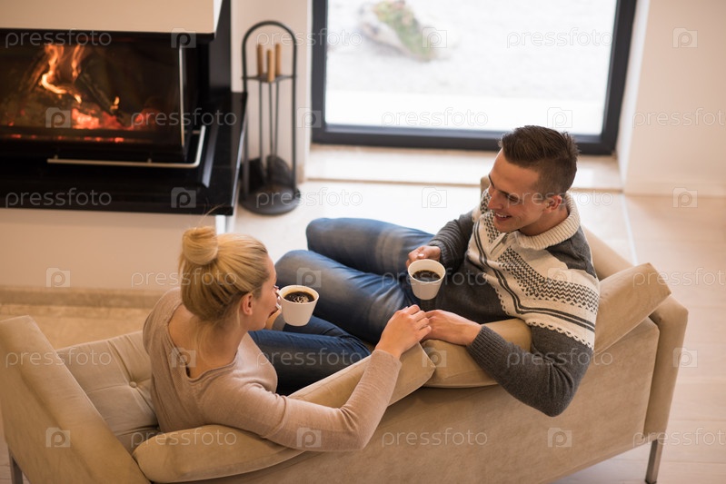 Молодая пара с кофе в гостиной
