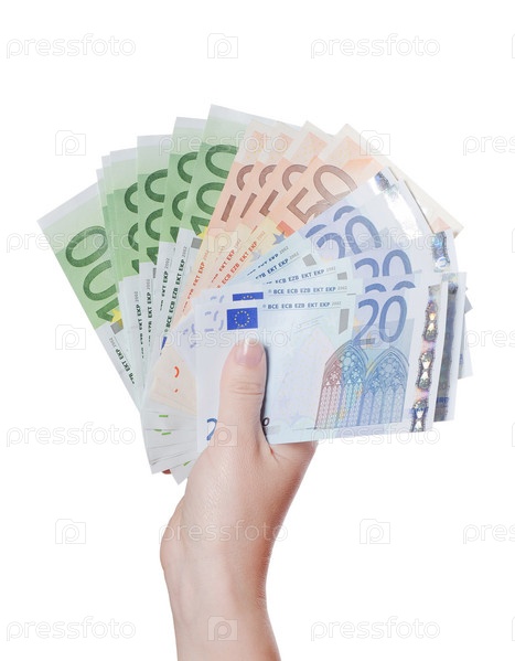 Банкноты евро в руке на белом фоне
