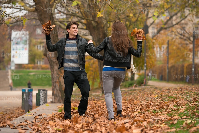 Счастливая молодая пара в осеннем парке
