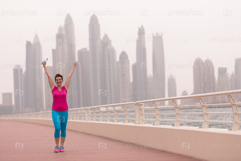 Молодая женщина празднует успешный финиш
