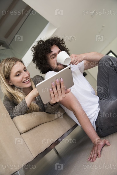 Пара отдыхаете дома с планшетом