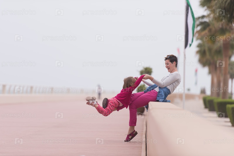 Мать и милая маленькая девочка на набережной у моря