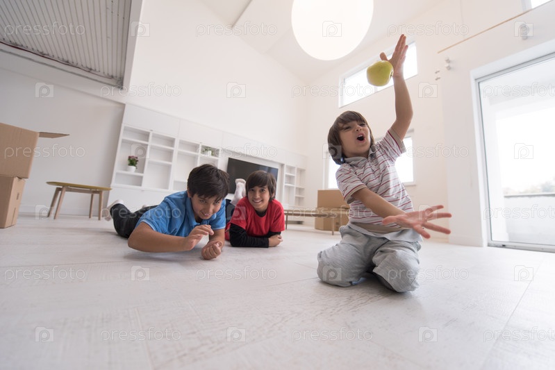 Мальчики веселятся с яблоком на полу