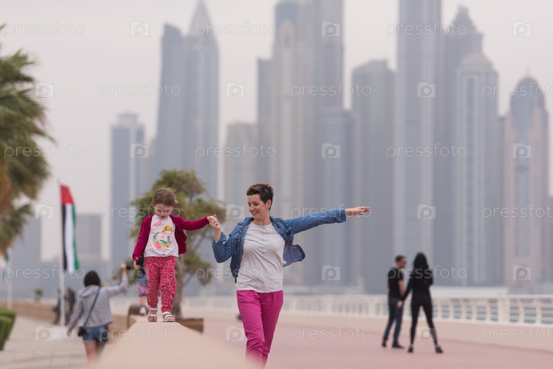 Мать и милая девочка на набережной