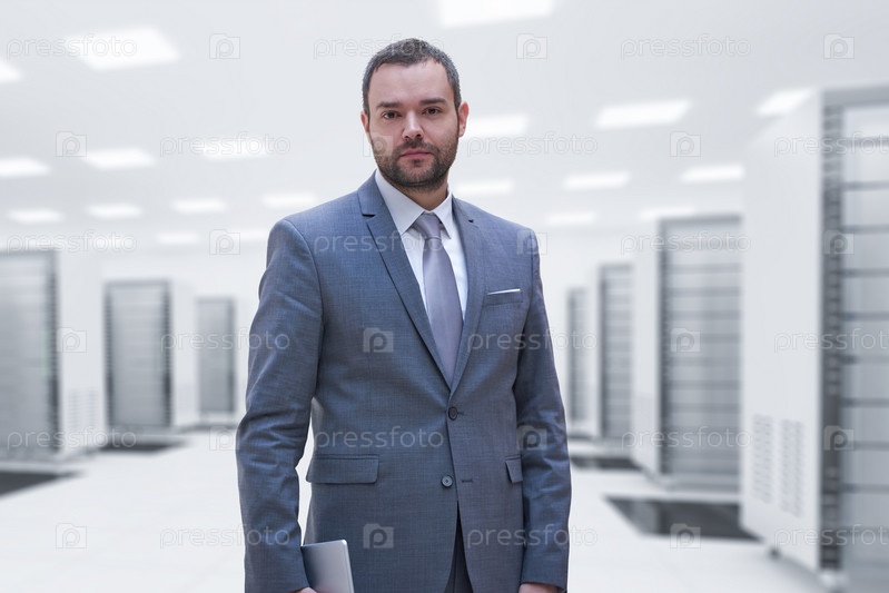 Молодой бизнесмен в серверной комнате