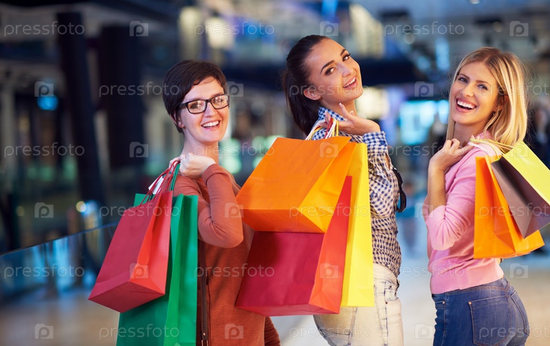 Счастливые молодые девушки в торговом центре