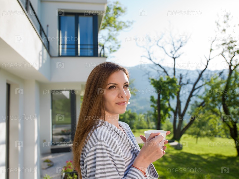 Женщина в халате, наслаждаясь кофе утром