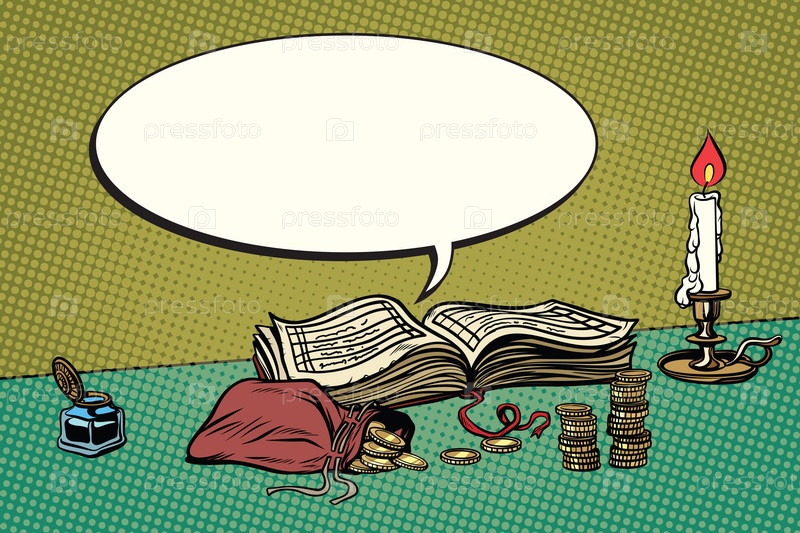 Винтажная бухгалтерская книга, свеча и золотые монеты