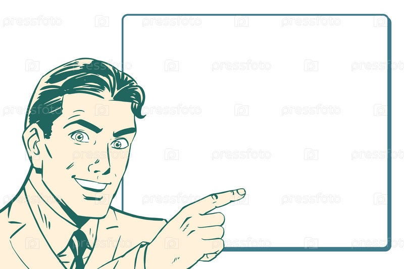 Предприниматель, указывая на плакат