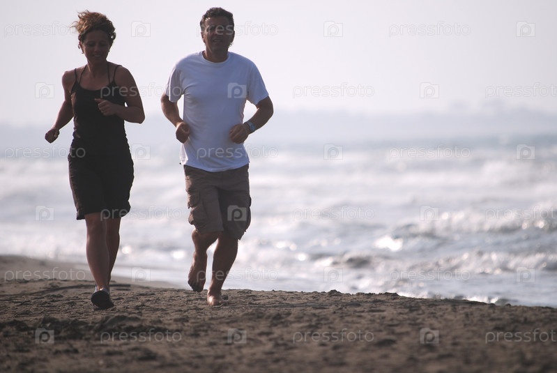 Пара бежит по пляжу