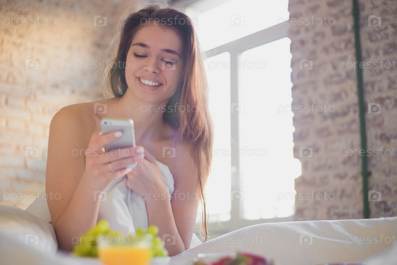 Красивая девушка в постели с телефоном