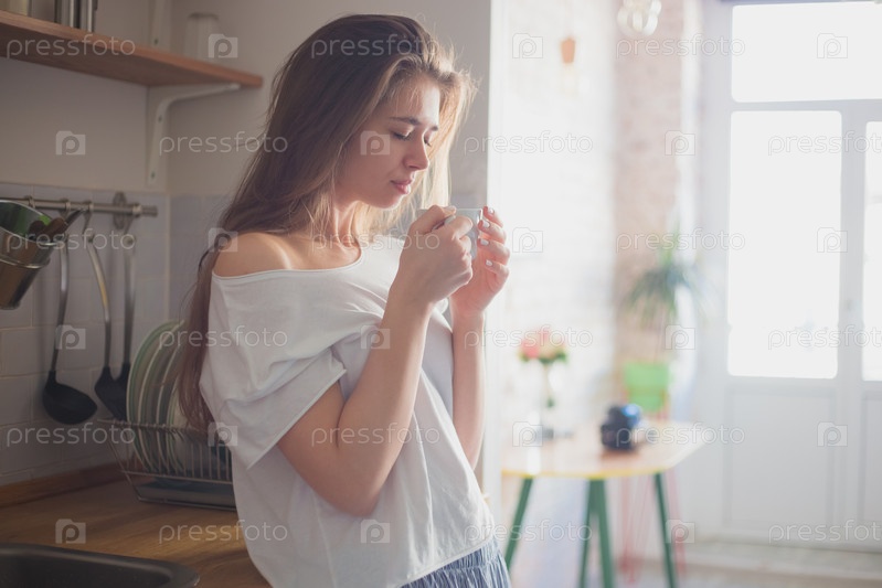 Красивая девушка на кухне с кофе