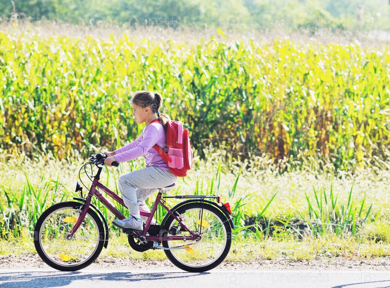 Девочка едет в школу на велосипеде