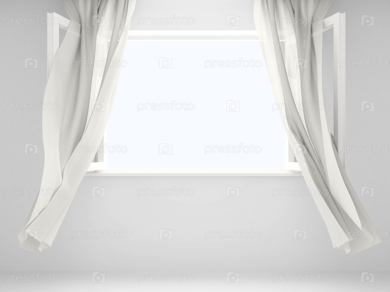 Открытое окно и шторы, развевающиеся на ветру