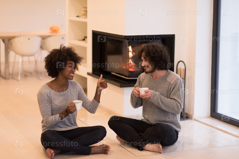 Многонациональная пара перед камином