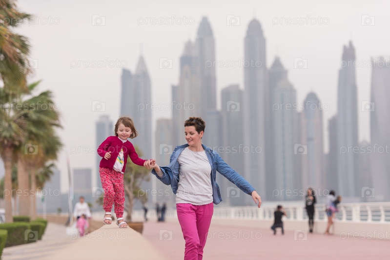 Мать и милая девочка на набережной
