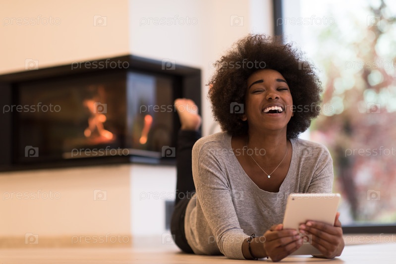Женщина, используя планшетный компьютер на полу