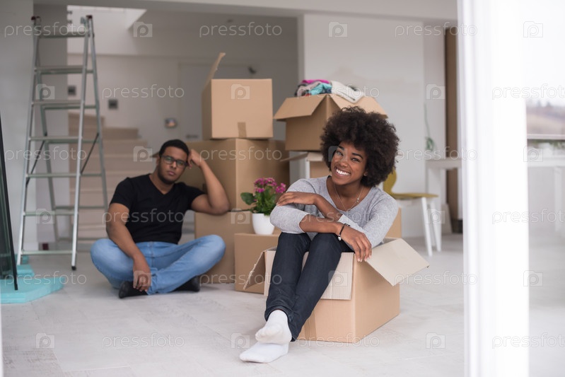 Молодая веселая пара в новом доме