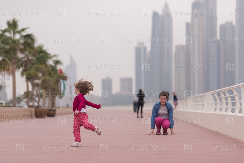Мать и милая девочка на набережной