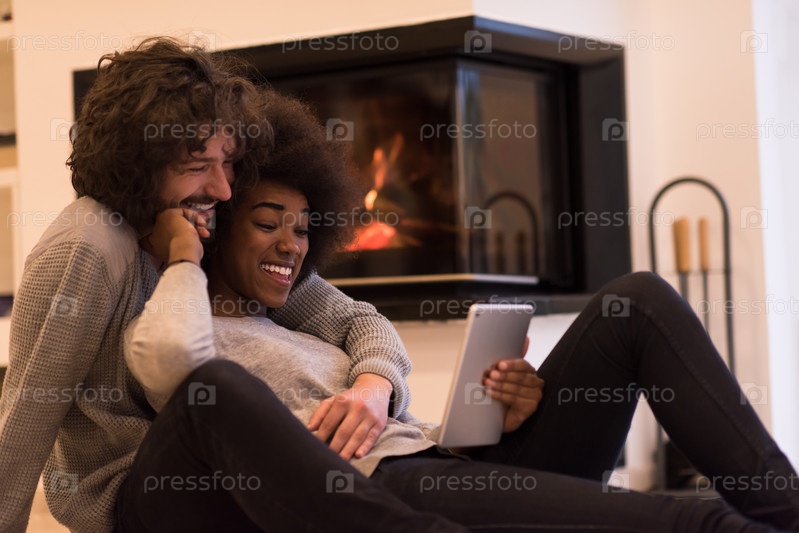Пара перед камином с планшетом