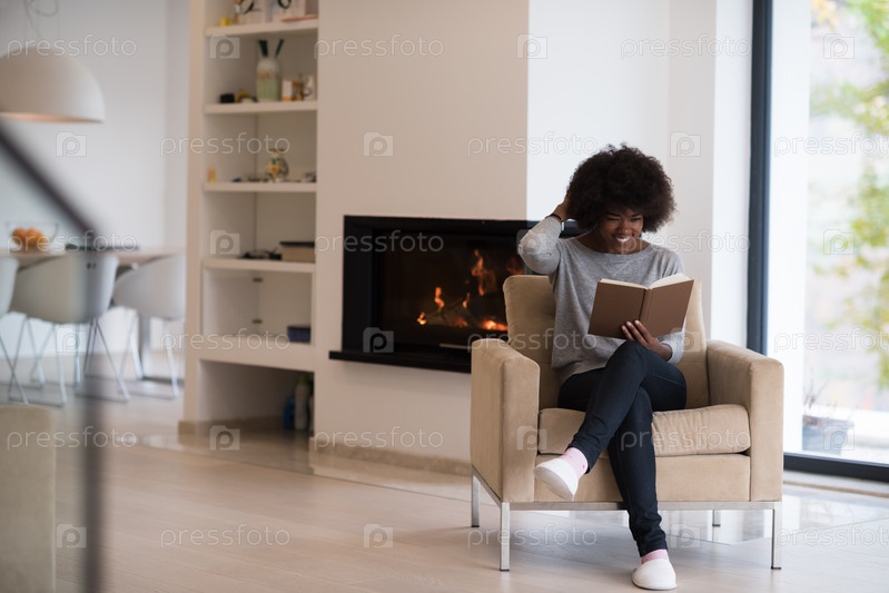 Черная женщина у себя дома читает книгу