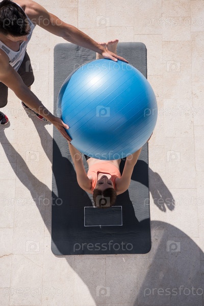 Женщина и личный тренер делает упражнение с мячом пилатес