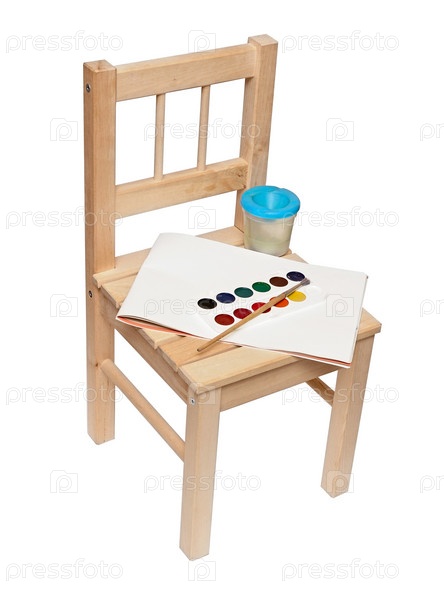 Маленький деревянный стул с красками и кистями для рисования, изолировано на белом