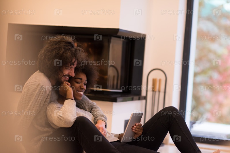 Пара перед камином с планшетом