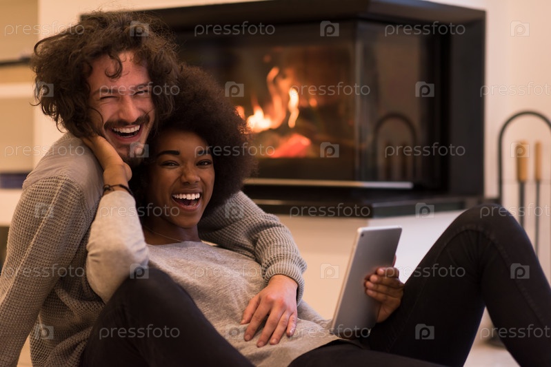 Пара обнимается перед камином