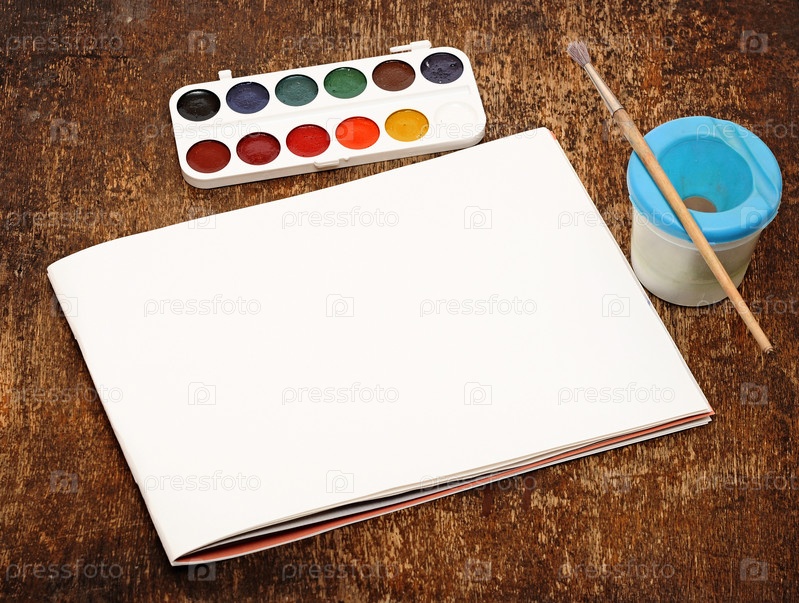 Набор красок, кисти и бумага на деревянном столе