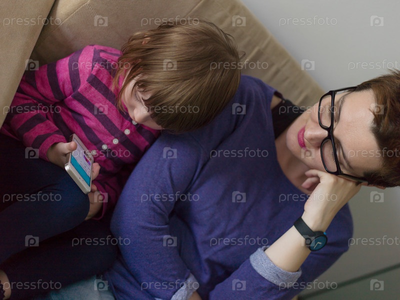 Мама и ее милая маленькая дочь пользуются мобильным телефоном